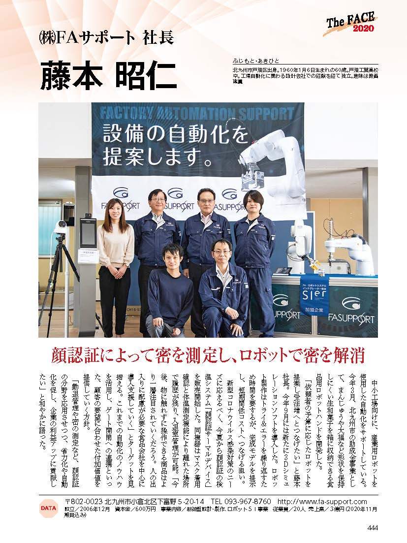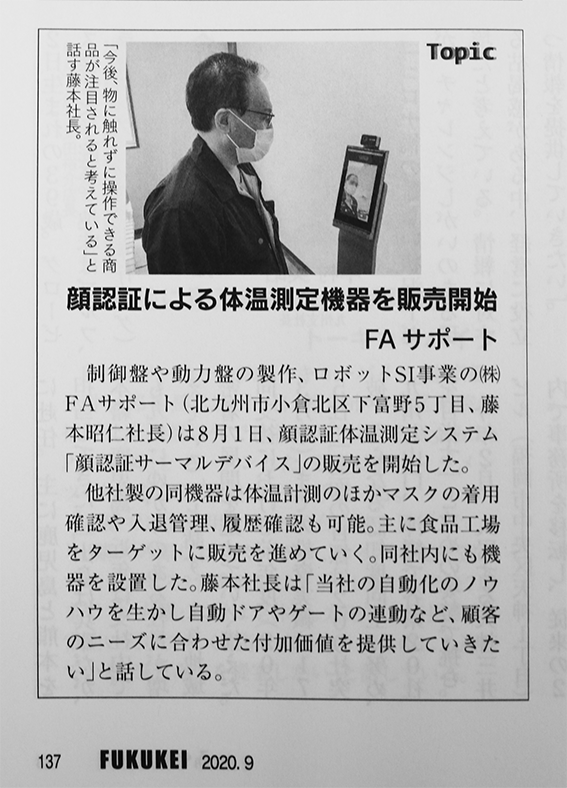 制御盤や動力盤の製作、ロボットSI事業の㈱FAサポート(北九州市小倉北区下富野5丁目、藤本昭仁社長)は8月1日、顔認証体温測定システム「顔認証サーマルデバイス」の販売を開始した。